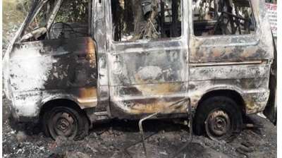 टक्कर में गई दो जिंदगियां, उग्र भीड़ ने जलाई वैन, इलाके में तनाव