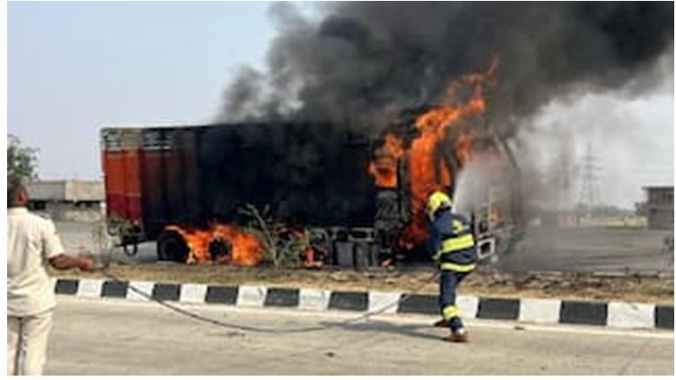 नेशनल हाईवे पर चल रहे ट्रक में भीषण आग, बाल-बाल बचे चालक और सहायक