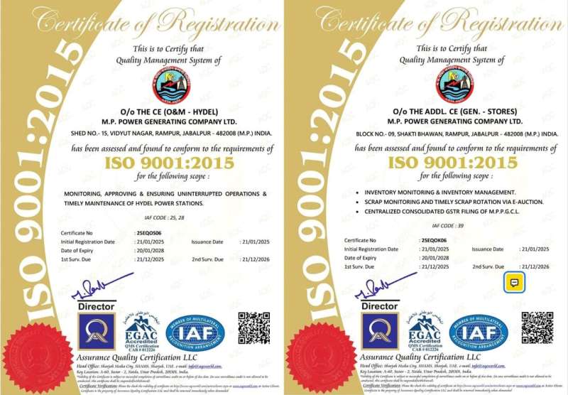 पॉवर जनरेटिंग कंपनी जबलपुर के दो कार्यालयों को मिला आईएसओ 9001 सर्टिफिकेशन
